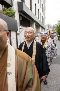 第1部開山大法要は、境内を僧侶のお練りに続き、金龍の舞が境内と本堂を一周。本堂では、式僧の天台声明の調べと、同山住職の密教の修法で聖天さまをご供養。第2部特別記念祭は、木遣りを先頭に、金龍の舞と聖天町会の神輿の渡御が行われ、山谷堀広場では、金龍の舞奉演、第五區頭連中の梯子乗り、木遣り、纏振り、神輿渡御が行われた。